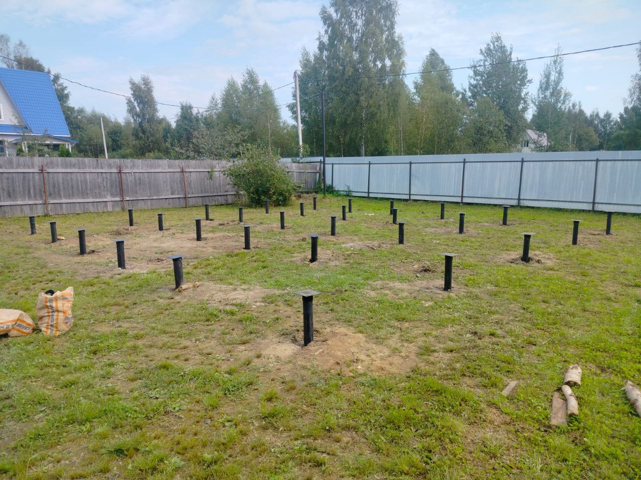 После установки свай на каждую из них были закреплены оголовки. Этот этап крайне важен, так как оголовки служат опорой для будущей обвязки фундамента. Правильная установка оголовков гарантирует, что дом будет иметь ровное и прочное основание.